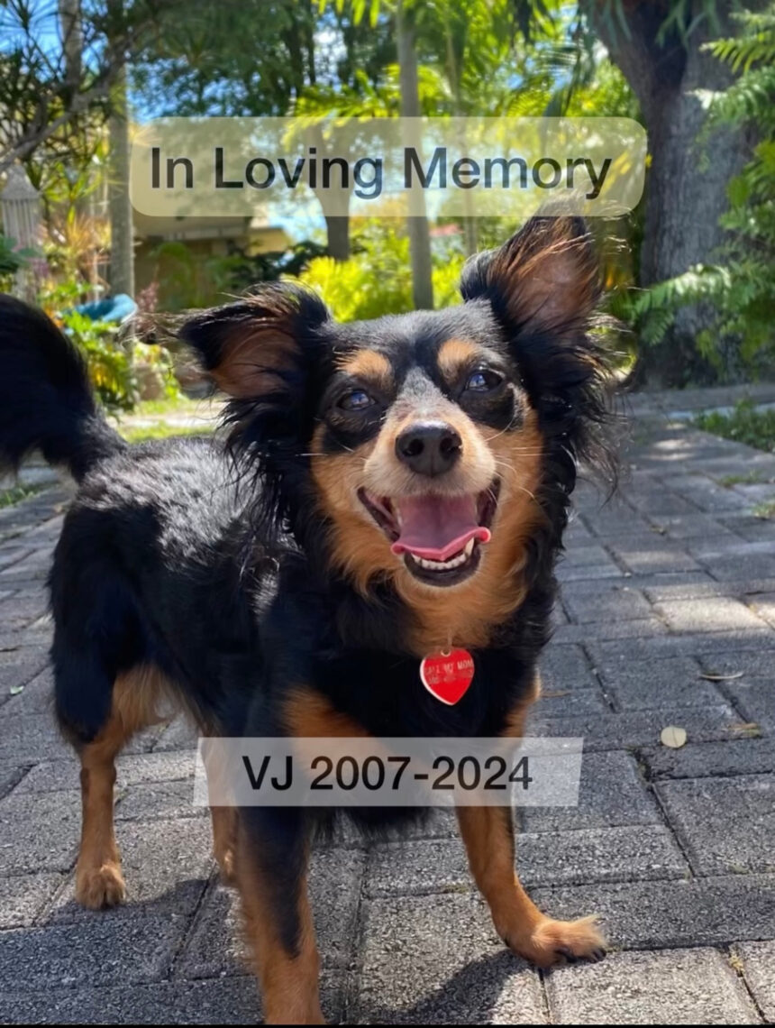 VJ n’était pas seulement un chien pour moi, elle était ma compagne inséparable et aimante pendant près de 17 ans. Elle aurait eu 17 ans en août. Le vide que je ressens sans elle en ce moment est navrant.