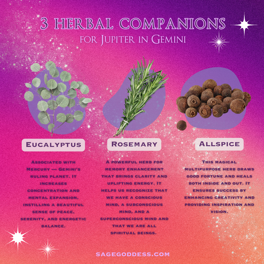- Eucalyptus: Associé à Mercure – la planète dirigeante des Gémeaux. Il augmente la concentration et l’expansion mentale, instillant un beau sentiment de paix, de sérénité et d’équilibre énergétique.