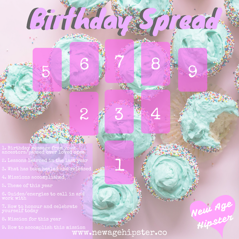 Le jour de ton anniversaire prenez le temps d’honorer votre voyage avec cette planche de tarot. Je le ferai moi-même demain, puis je me dirigerai vers Camden, Londres pour des hamburgers végétaliens sales, des bières et du shopping vintage ! 😀